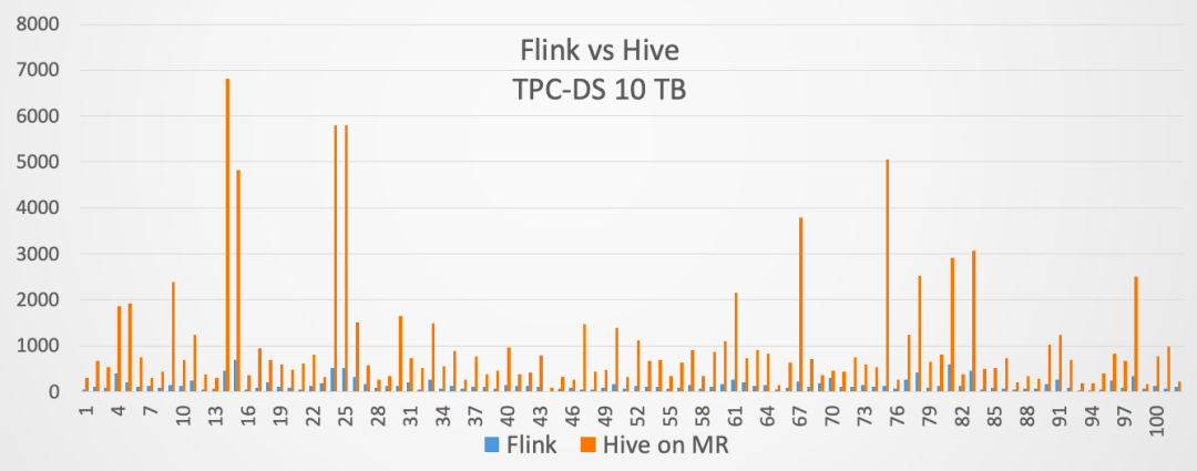 因此,我们在Flink 1.9当中,就开始提供了与Hive集成的功能。当然在1.9版本里面,这个功能是作为试用版发布的。到了Flink 1.10版本,与Hive集成的功能就达到了生产可用。同时在Flink 1.10发布的时候,我们用10TB的TPC-DS测试集,对Flink和Hive on MapReduce进行了对比,对比结果如下: