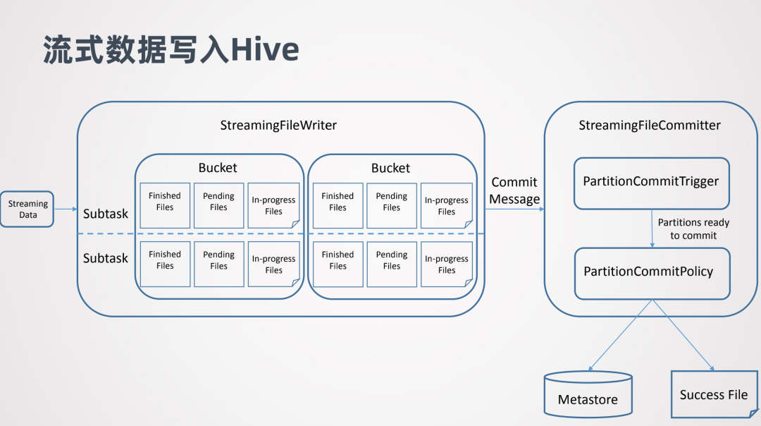 主要是两个部分,一个是StreamingFileWriter,借助它实现数据的写入,它会区分Bucket,这里的Buck类似Hive的分区概念,每个Subtask都会往不同的Bucket去写数据。每个Subtask写的Bucket同一个时间可能会维持3种文件,In-progress Files表示正在写的文件,Pending Files表示文件已经写完了但是还没有提交,Finished Files表示文件已经写完并且也已经提交了。
