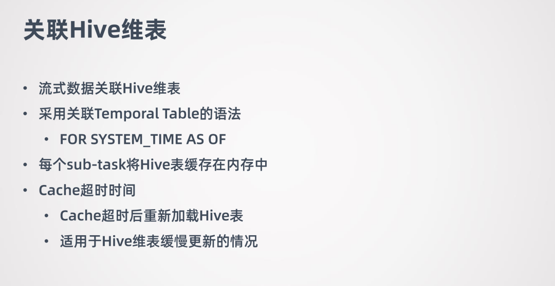 关于Hive跟流式数据结合的另一个场景就是:关联Hive维表。例如在消费流式数据时,与一张线下的Hive维表进行join。