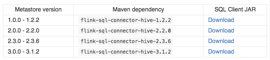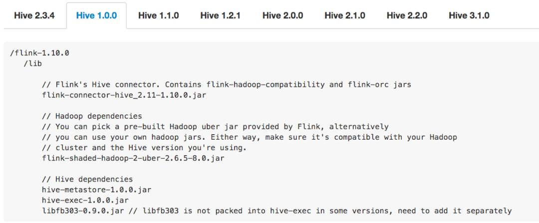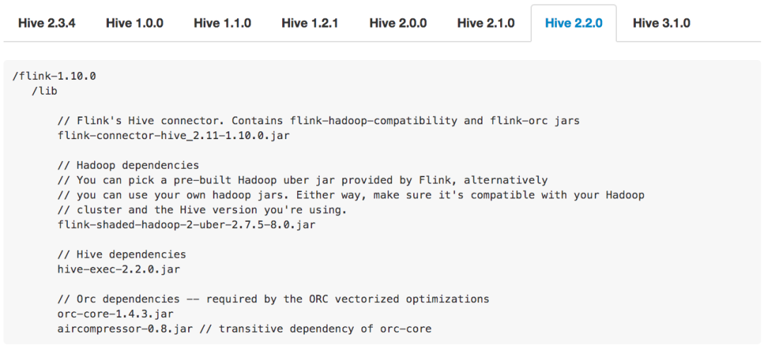 所以我们希望能简化依赖管理,给用户提供更好的体验。具体的做法是,在Flink 1.11版本中开始,会提供一些预先打好的Hive依赖包: