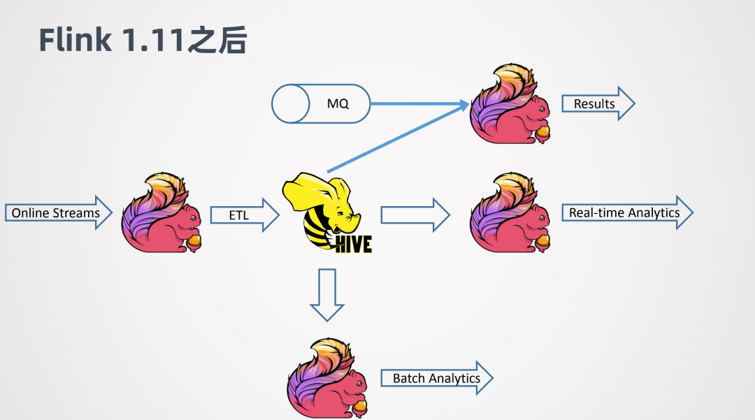例如Online的一些数据,用Flink做ETL,去实时的写入Hive。当数据写入Hive之后,可以进一步接一个新的Flink job,来做实时的查询或者近似实时的查询,可以很快的返回结果。同时,其他的Flink job还可以利用写入Hive数仓的数据作为维表,来跟其它线上的数据进行关联整合,来得到分析的结果。