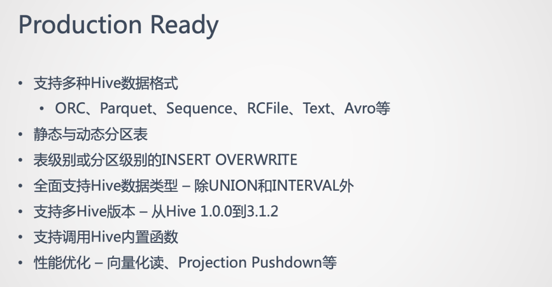 在Flink 1.10中,对接Hive的功能已经实现了Production Ready。实现Production Ready主要是认为在功能上已经完备了。具体实现的功能如下: