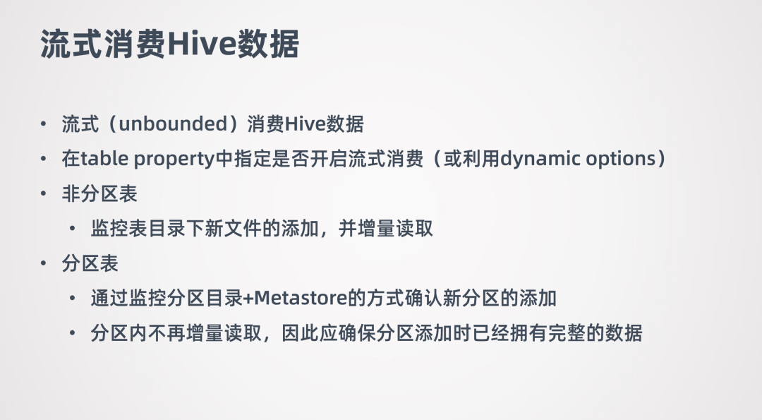 流式消费Hive支持分区表和非分区表。对于非分区表会监控表目录下新文件添加,并增量读取。对于分区表通过监控分区目录和Metastore的方式确认是否有新分区添加,如果有新增分区,就会把新增分区数据读取出来。这里需要注意,读新增分区数据是一次性的。也就是新增加分区后,会把这个分区数据一次性都读出来,在这之后就不再监控这个分区的数据了。所以如果需要用Flink流式消费Hive的分区表,那应该保证分区在添加的时候它的数据是完整的。
