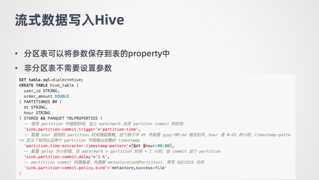 另一个关键的是它不提供Hive语法的兼容。如果设置了Hive Dialect并可以创建分区表,但是创建分区表的DDL并不是Hive的语法。