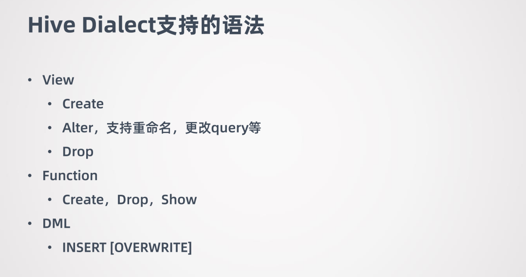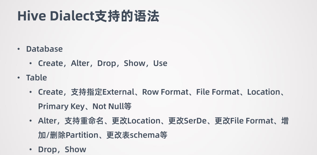 Hive Dialect的语法主要是在DDL方面进行了增强。因为在1.10中通过Flink SQL写DDL去操作Hive的元数据不是十分可用,所以要解决这个痛点,将主要精力集中在DDL方向了。