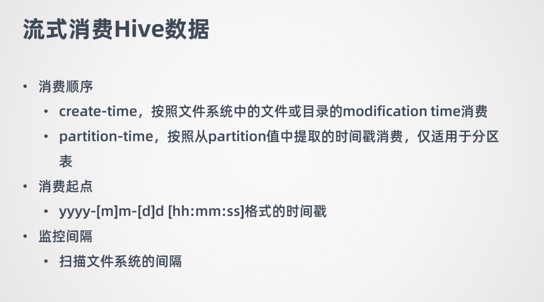 流式消费Hive数据也需要额外的指定一些参数。首先要指定消费顺序,因为数据是增量读取,所以需要指定要用什么顺序消费数据,目前支持两种消费顺序create-time和partition-time。