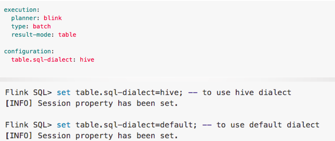 给Dialect做了参数化,目前参数支持default和hive两种值。default是Flink自身的Dialect,hive是Hive的Dialect。