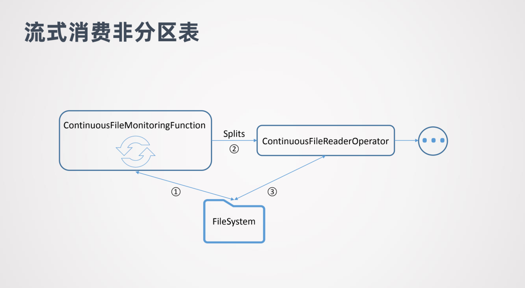 图中ContinuoousFileMonitoringFunction会不断监控非分区表目录下面的文件,会不断的跟文件系统进行交互。一旦发现有新的文件添加了,就会对这些文件生成Splits,并将Splits传到ContinuoousFileReaderOperator,FileReaderOperator拿到Splits后就会到文件系统中实际的消费这些数据,然后把读出来的数据再传往下游处理。