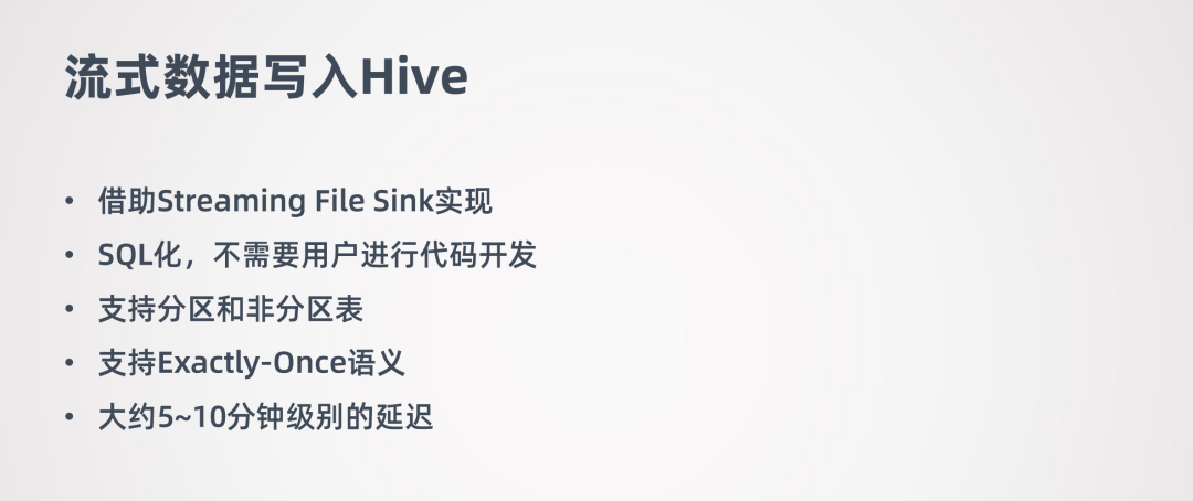 流式数据写入Hive是借助Streaming File Sink实现的,它是完全SQL化的,不需要用户进行代码开发。流式数据写入Hive也支持分区和非分区表。Hive数仓一般都是离线数据,用户对数据一致性要求比较高,所以支持Exactly-Once语义。流式数据写Hive大概有5-10分钟级别的延迟。如果希望延迟尽可能的低,那么产生的一个结果就是会生成更多的小文件。小文件对HDFS来说是不友好的,小文件多了以后,会影响HDFS的性能。这种情况下可以做一些小文的合并操作。