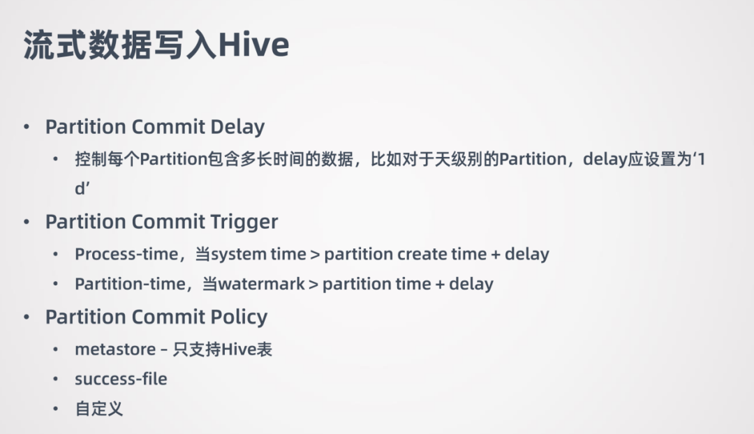 Partition Commit Policy表示用什么方式提交分区。对于Hive来说,是需要将分区提交到metastore,这样分区才是可见的。metastore策略只支持Hive表。还有一个是success-file方式,success-file是告诉下游的作业分区的数据已经准备好了。用户也可以自定义,自己去实现一个提交方式。另外Policy可以指定多个的,例如可以同时指定metastore和success-file。