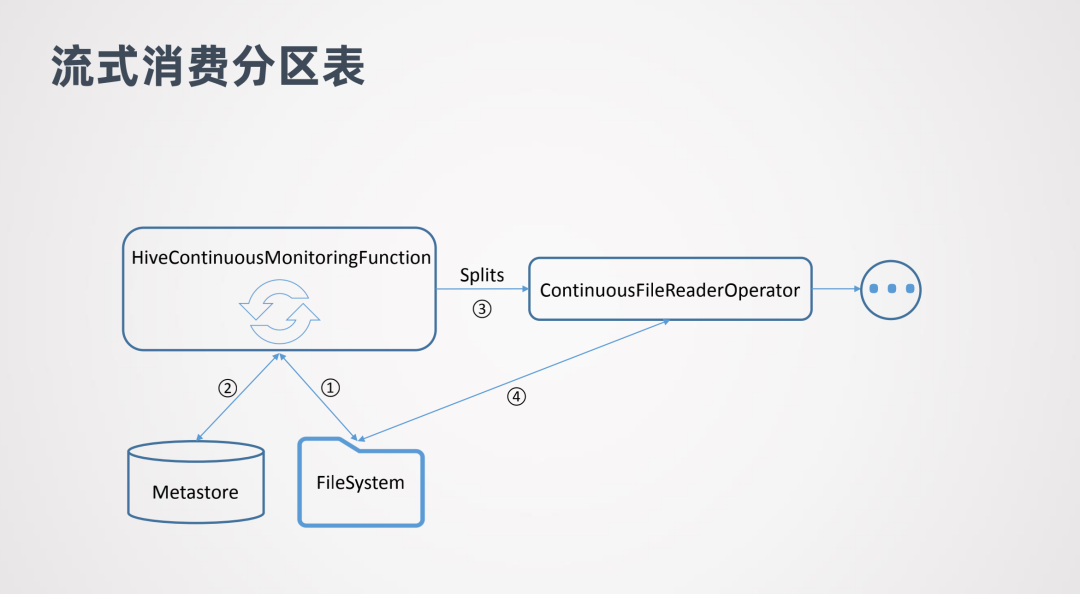 对于流式消费分区表和非分区表区别不是很大,其中HiveContinuousMonitoringFunction也会去不断的扫描文件系统,但是它扫描的是新增分区的目录。当它发现有新增的分区目录后,会进一步到metstore中做核查,查看是否这个分区已经提交到metstore中。如果已经提交,那就可以消费分区中的数据了。然后会把分区中的数据生成Splits传给ContinuousFileReaderOperator,然后就可以对数据进行消费了。