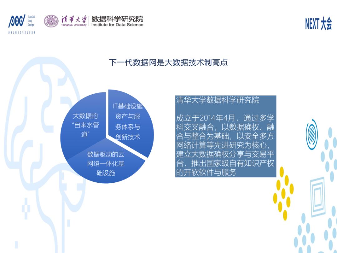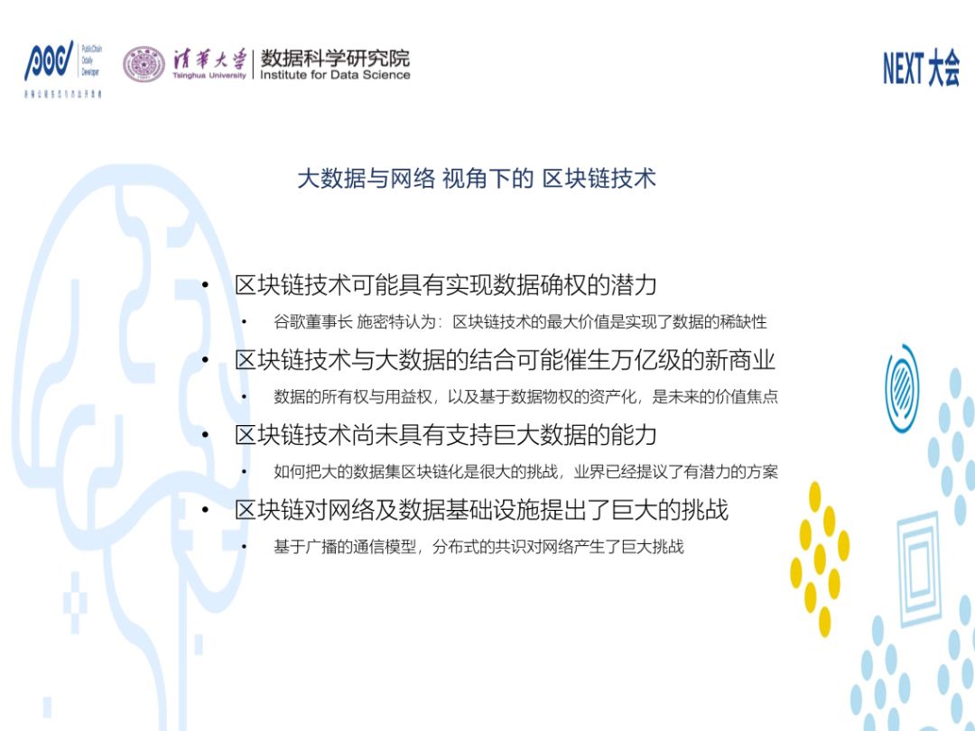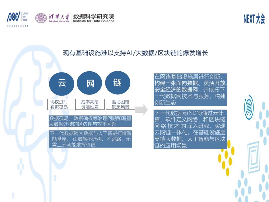现有的三大核心技术云、网、链各自有一些缺点。数据协议方面,有数据孤岛的问题,成本和灵活性的问题及数据确权和效率的问题,这是清华大学下一代数据网络试图解决的问题,最主要的方法是通过区块链技术的研究和产业化方面来做一些动作。