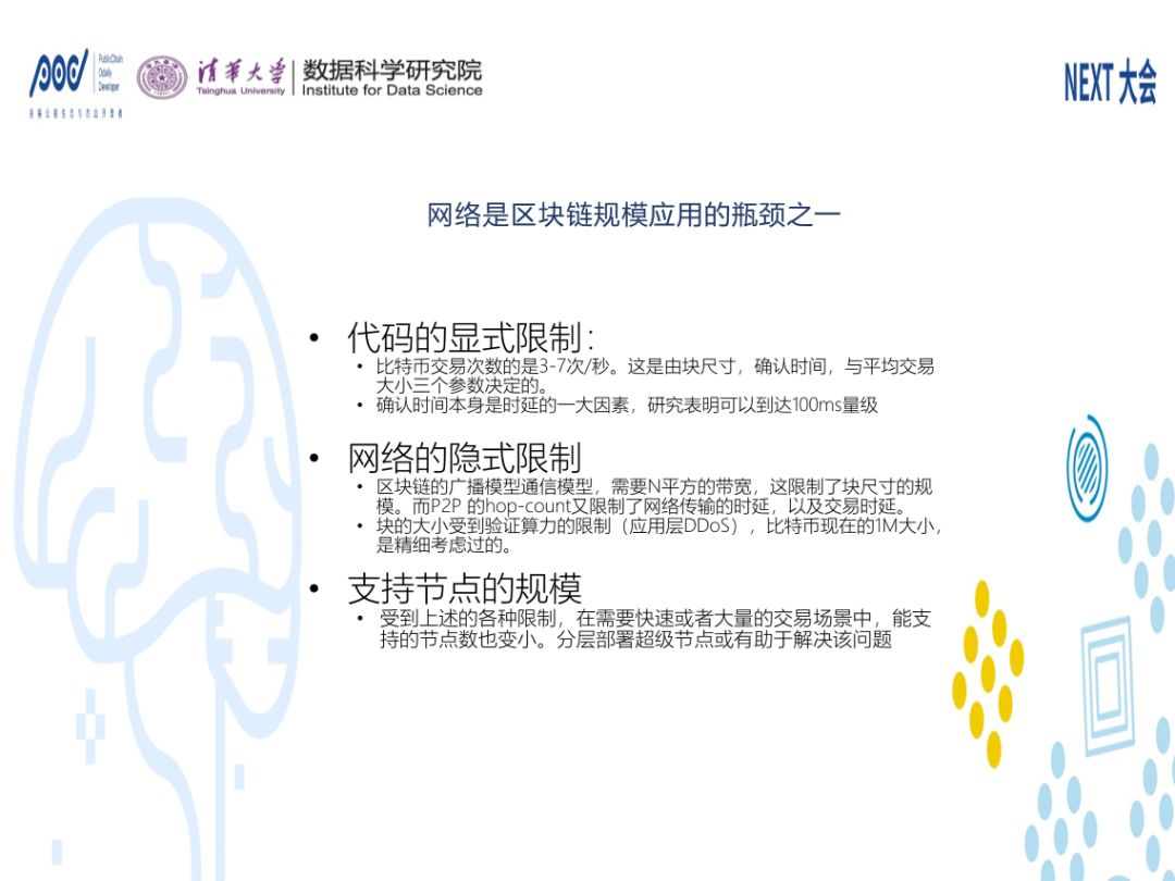 第二,交易的时延和带宽是不一样的东西。比如我烤匹萨10个小时,同时烤了10块匹萨,我回头跟人说,10个小时烤了10个披萨,平均时间1小时。这里面是有误导的。时延就是说,到底烤一块匹萨多久,这对于实际应用很有价值。我们来看看它受到什么限制呢?一些是我们看得见的,就是代码里面可以看到,就是显示限制,比如交易尺寸、快、平均大小。当像中本聪这样世界级的设计者,他们设计的时候,是考虑后面的限制。算法现在的研究可以达到100毫秒以下,我们网络也做到100毫秒以下,1+1等于200毫秒,再给以3倍的安全系数,目标可以到600毫秒。由于广播的模型,会导致它的规模也不会很大,所以要解决这个问题,可能要通过一些分集,用联盟链的方法来处理。