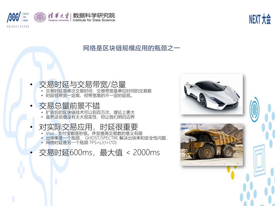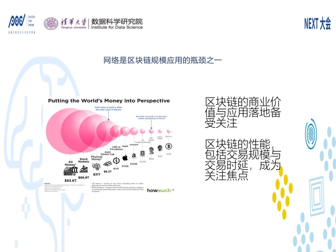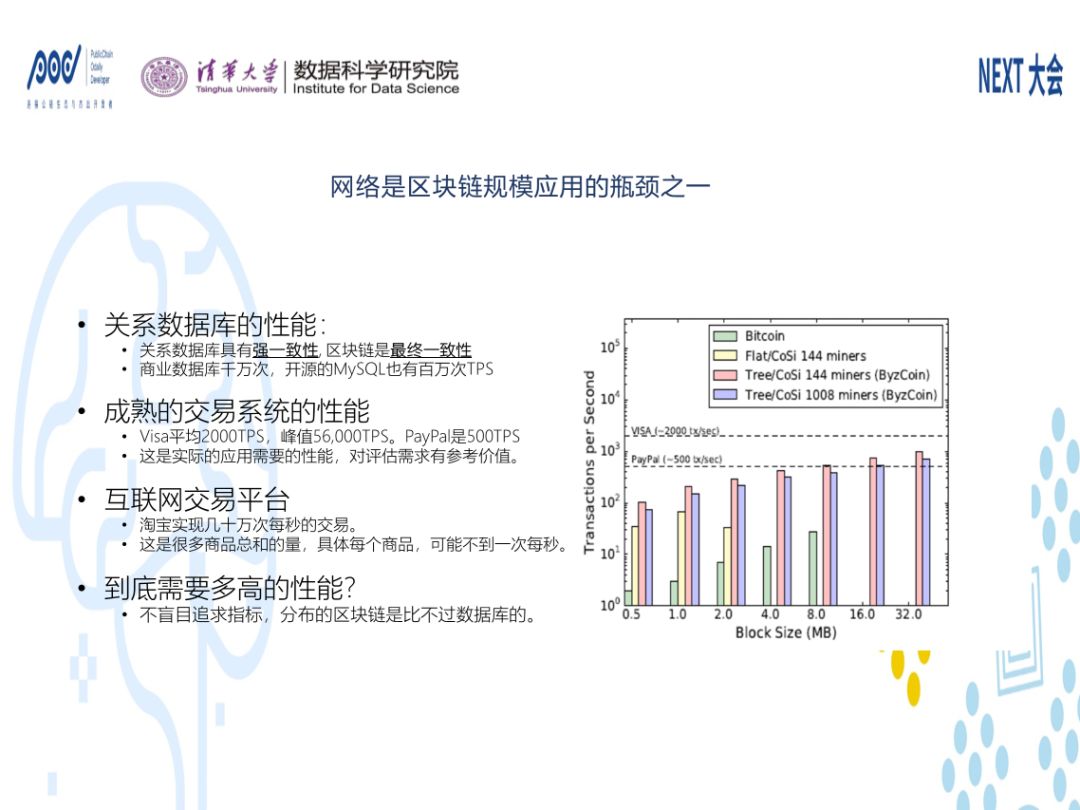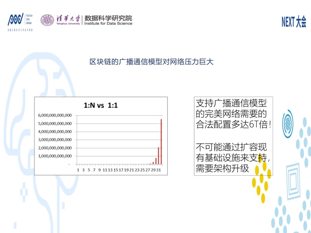 第四,区块链对于网络本身也提出了巨大挑战。区块链在技术上有三大块,一个是分布式共识,一个是加密,一个是基于P2P的广播。P2P的广播是广播的一种,是基于点对点实现的。广播对于网络来讲是很可怕的东西,因为N到N远远大于1到1的量。如果有一个网络可以支撑完美的通信的话,它需要什么呢?它需要网络的有效载荷即有效排列组合可以达到N的N次方,而普通网络只有达到N的阶层数字,这两个数字差距非常的大。我们认为网络是区块链规模应用的瓶颈之一,一方面它的商业价值备受关注,另一方面它的规模和实验,成为关注的焦点。