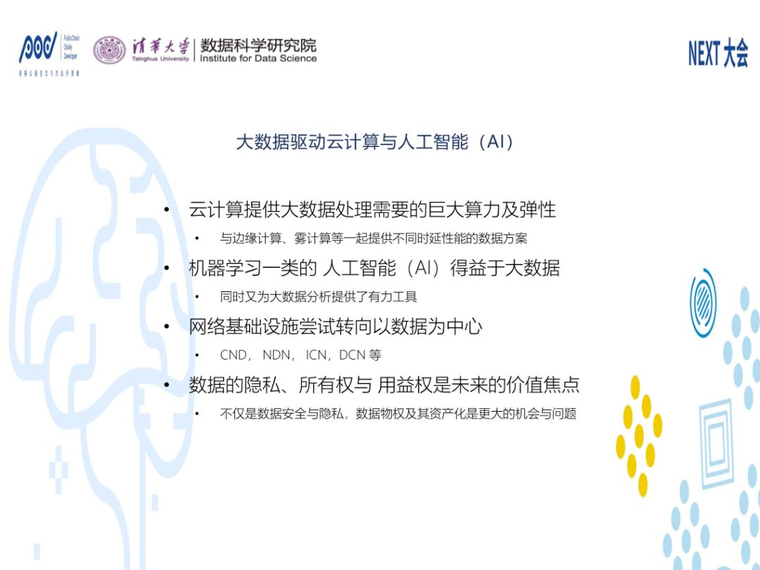 基础设施试图转向以数据为中心的场景,大家已经比较熟悉一些CDN、NDN、ICN、DCN,本质是把网络从比特流转向数据。我们认为未来的价值焦点,也就是从大数据视角来看,它不仅仅是数据隐私的问题,首先是数据的所有权。数据的隐私,首先数据是我的,你凭什么拿去用,拿去用有没有好处,这个好处是不是我应该得到。这才是我们认为下一阶段大数据的核心问题。