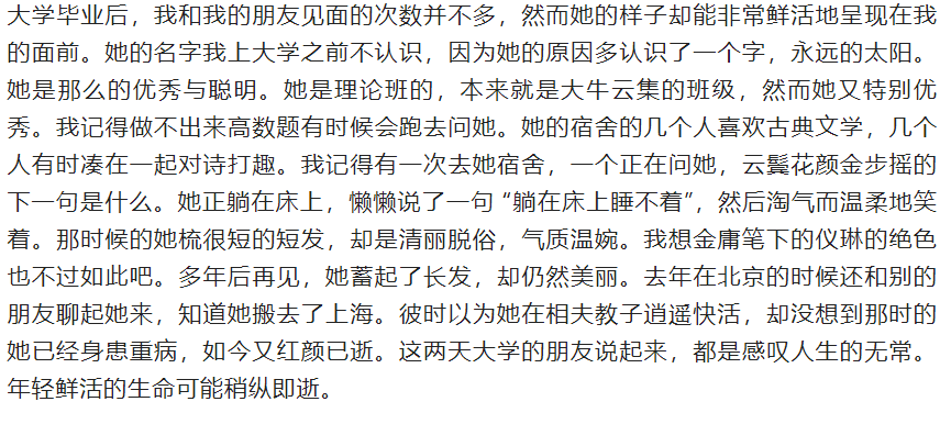 她回忆起李昶在大学期间,爱好诗词,曾经对出过精妙的半阕诗;她回忆起自己还曾经向李昶请教过数学问题;她还回忆起,李昶的短发,她的飘逸,和她的淘气。