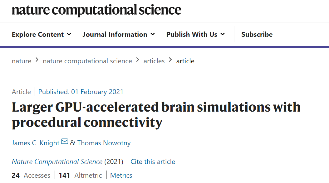 通常来说,这种级别的大脑模拟需要超级计算机来提供强大的内存,但萨塞克斯大学的研究者提出了一种更加高效的技术,可以大幅降低模拟过程中所需存储的数据量。他们的方法被称为「程序性连接(procedural connectivity)」,相关研究发表在 Nature 新子刊——《Nature Computational Science》上。这份子刊于 2021 年 1 月启动,主要发表与计算技术和数学模型开发及使用相关的研究,以及它们在一系列科学学科(包括但不限于生物信息学、化学信息学、地理信息学、计算物理学和宇宙学、材料科学和城市科学)领域的应用。
