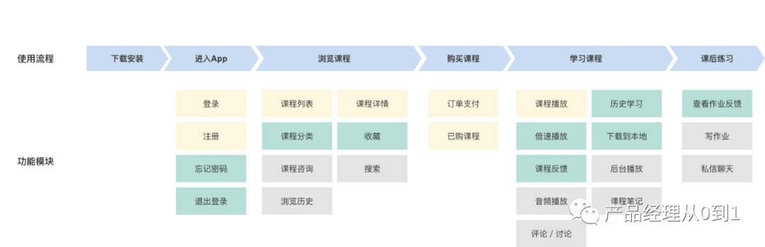那用户的核心使用路径就是:下载安装——进入App——浏览课程——购买课程——学习课程——课后练习。