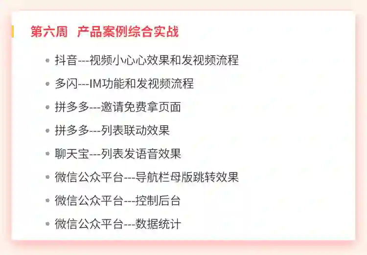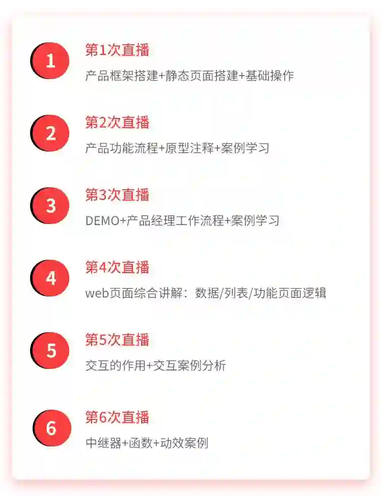 Axure实战班安排了6次直播课,老师会在直播课上讲解更多的交互和产品设计。让你在学Axure的同时,培养对产品的理解,对交互的感觉