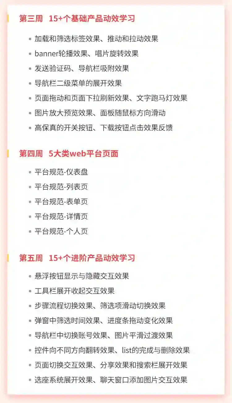 在前2周功能基础掌握的情况下,你会系统学习到web端、手机端的产品交互动效,进阶学习切换、拖动、平滑等15+个进阶效果