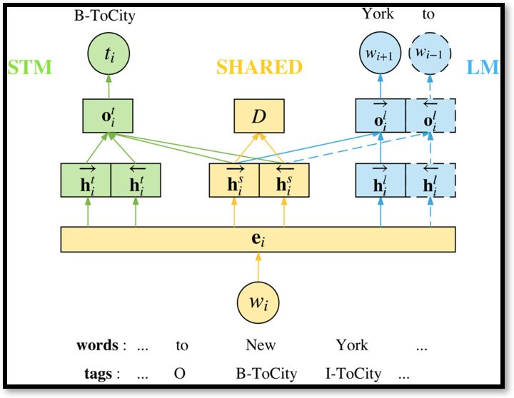 我们提出了另一种高效的多任务学习方法,共享-私有模型(shared-private model,SPM),它可以更好地改善并泛化 SLU 模型。具体地说,SLU 模型和语言模型通过一个共享空间和两个任务独立的私有空间结合在一起。此外,我们还研究了一个对抗任务判别器,作为共享隐层空间的竞争对手。任务判别器的目标是要判别共享特征是为哪个任务服务的。为了混淆任务判别器,共享空间会被驱使保存任务无关信息。任务判别器可应用于字层面或句层面,也就是说,为每个字或每句话预测任务指示的可能性。