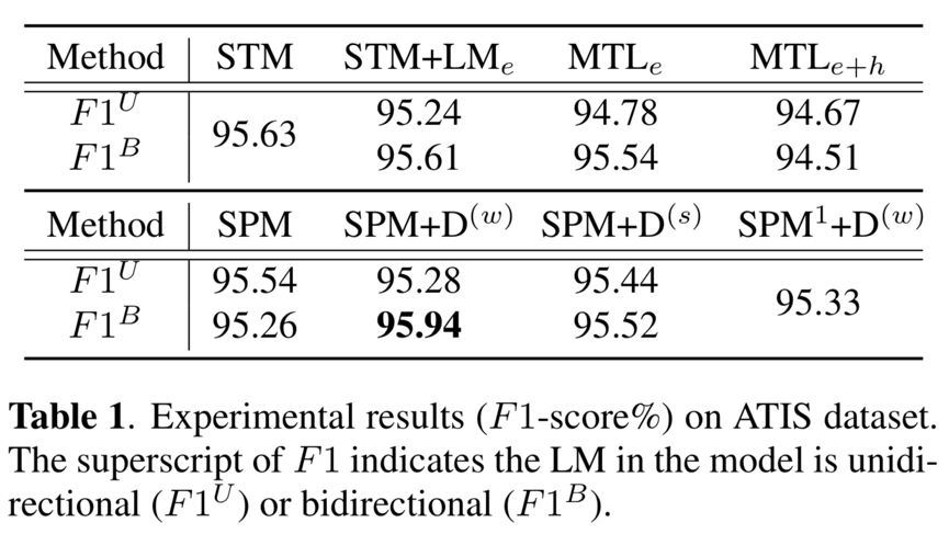 其中,双向共享-私有模型和字层面判别器取得了最好的性能,即 95.94%。之前最好的结果是由 Zhai 等提出的结果,即 95.86%。此外,配有双向语言模型的框架大多都比其对应的配有单向语言模型的框架性能更好。这意味着,同时考虑上下文信息对获取语义槽标注的泛化特征十分有帮助。