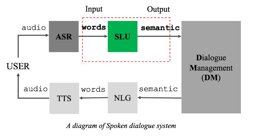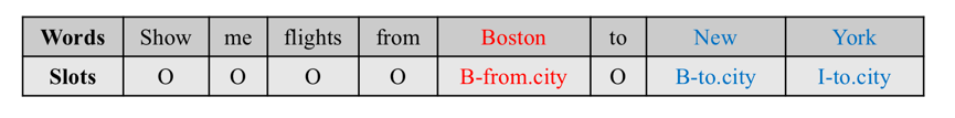 口语语义理解模块是目标导向的口语对话系统的重要部分,它把用户的语句解析为对应的语义信息。例如,句子「Show me flights from Boston to New York」可以被解析为 (fromloc.city name=Boston, toloc.city name=New York)。这通常被认为是一个语义槽填充(slot filling)任务,对句子中的每个字都分配一个预先定义的语义标签。在 In/Out/Begin (IOB) 模式下,这个例子可以被表示为: