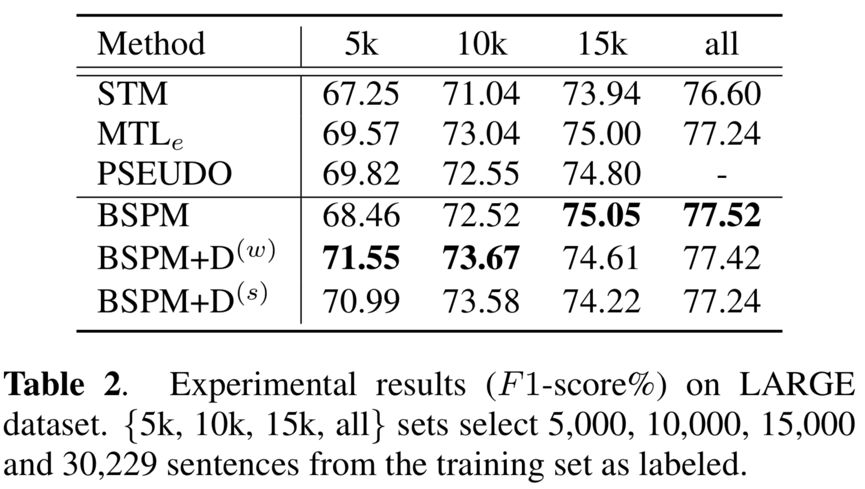 考虑到 ATIS 数据量的有限性和构建一个在多个领域上语义槽模型的必要性,我们跟随 Kurata 的工作,把 MIT Restaurant,MIT Movie 和 ATIS 数据集合并为一个大规模的数据集,记为 LARGE。这个合并的数据集包含了在三个不同领域中 30229 条训练语句和 6810 条测试语句。这些字被分配到 116 个不同的语义槽标签上(算上 IOB 前缀有 191 个)。对于半监督学习,「5k,10k,15k」条训练语句被随机选为标注数据,剩余的训练语句则为未标注数据。对于每个标注数据集,我们随机选取 80% 作为训练集,剩余 20% 作为校验集。其结果如表 2 所示。