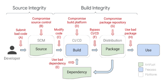 一个典型的软件供应链的例子,以及链中每个环节上可能发生的攻击的例子 *