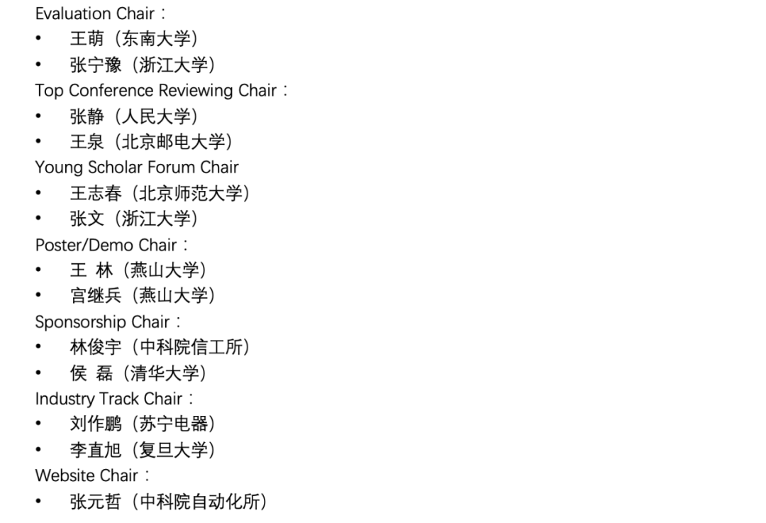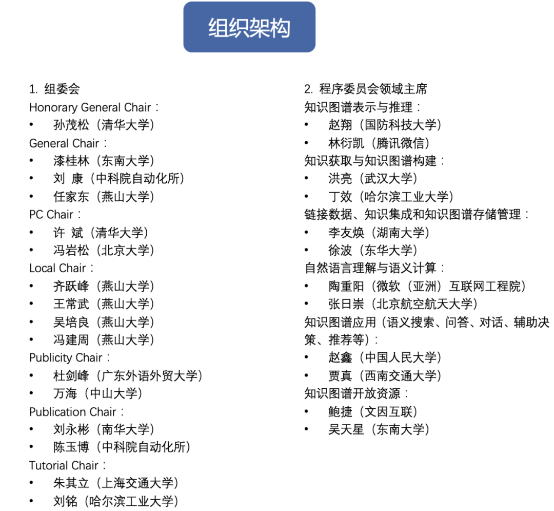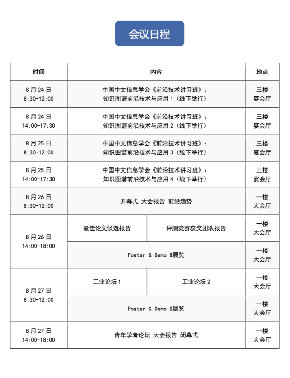 会议将包括学术讲习班、大会特邀报告、工业界论坛、评测与竞赛、知识图谱顶会回顾、海报与系统展示及学术论文报告等环节。大会将邀请国内外知名学者讲授相关领域的最新进展、发展趋势和实战经验,工业界论坛将邀请产业界的主要研发人员分享经验,促进产学研合作。