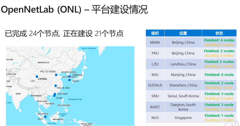 OpenNetLab 的诞生正是为了应对这些挑战,可以为研究人员提供基于现实网络的真实数据,并能实地训练和验证网络模型。OpenNetLab 开放网络平台通过构建分布式节点收集不同区域、形态、场景的网络数据。现阶段,微软亚洲研究院计划与合作高校一起在亚洲范围内建设 40 多个分布式异构节点。