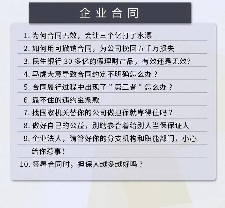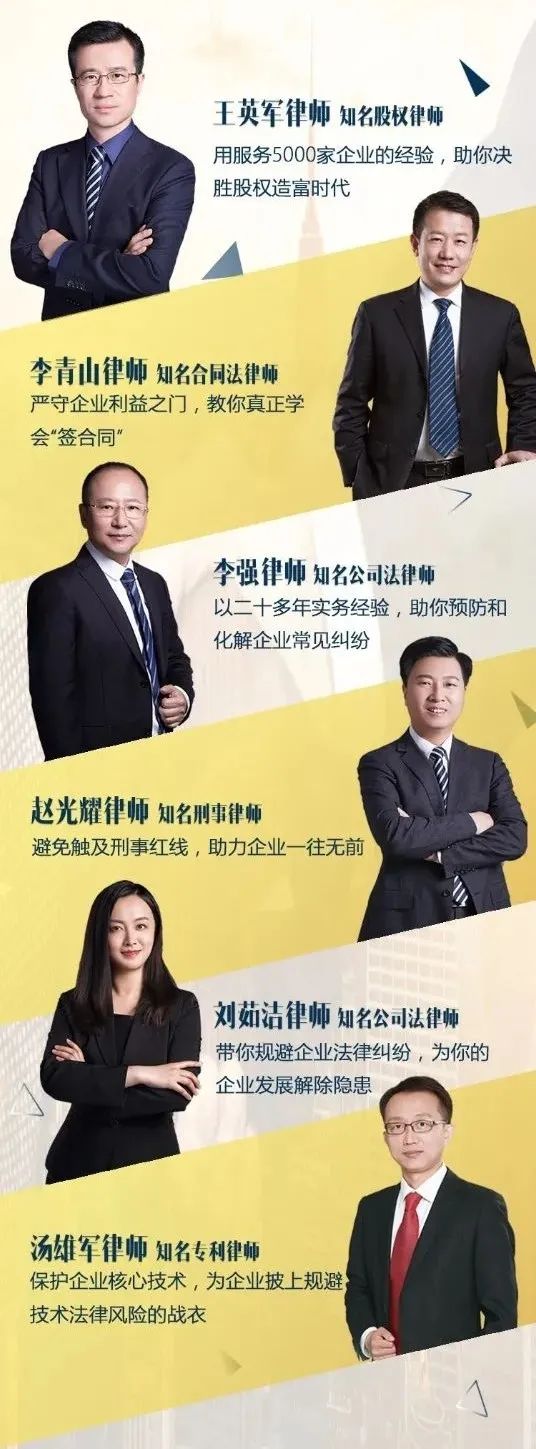 这门课程的每一位讲师都是身经百战的专业律师,他们将实战经验与经典案例相结合,把每一个枯燥的法律知识点讲得通俗易懂、妙趣横生,法律小白也能听得懂、记得住,是一门具备实用性的企业抗风险法律宝典。