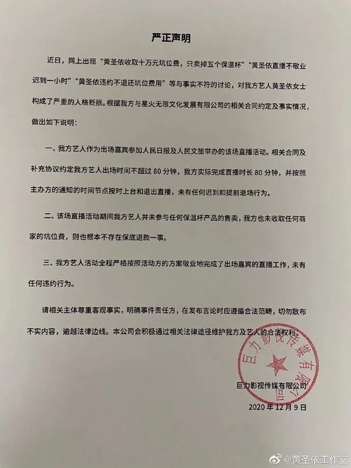 12月9日,针对此前媒体报道“黄圣依收10万坑位费,只卖出5个杯子”,黄圣依工作室发声明称其不实。该声明称,黄圣依未参与保温杯的售卖,也没有收取任何商家的坑位费。据媒体报道,某直播代运营平台在10月25日邀请了黄圣依合作直播,为某知名家电品牌的新品保温杯带货。从数据来看,黄圣依坑位费最贵,但是销售额最差的,仅卖出5个杯子,销售额695元。