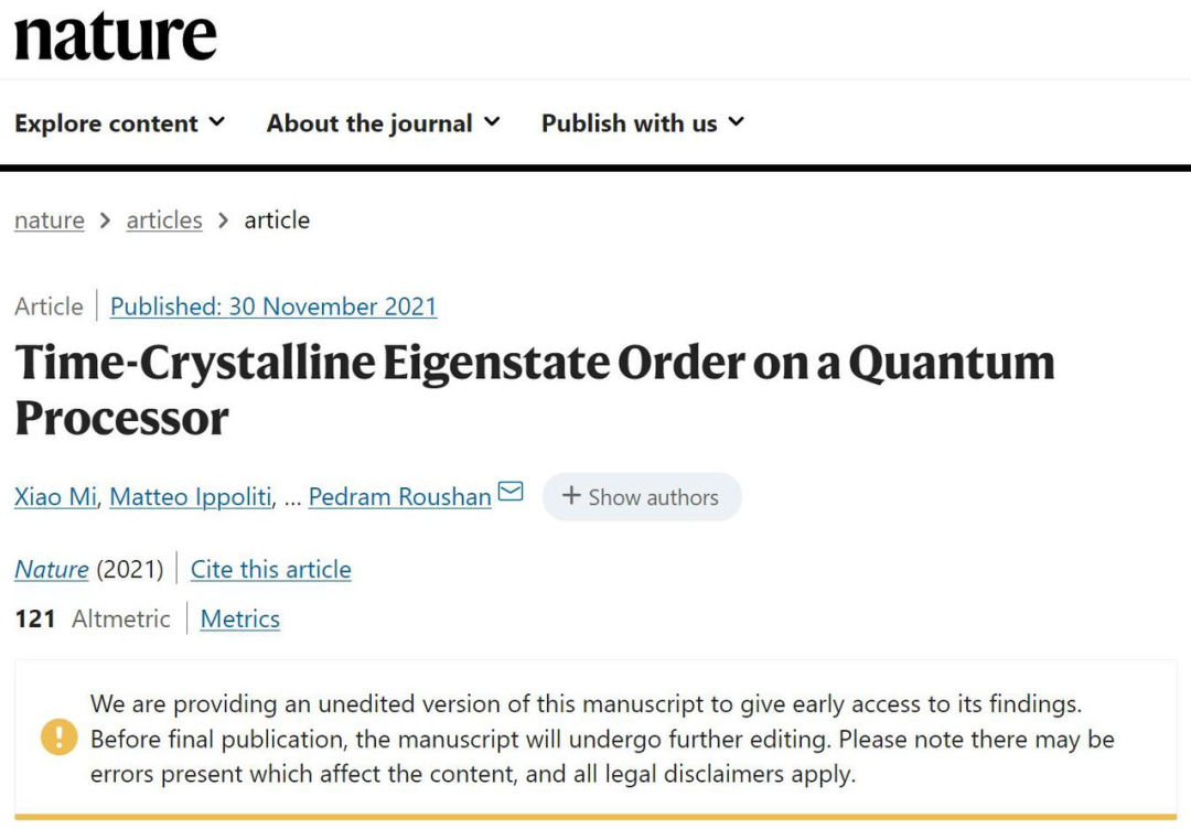 11 月 30 日,顶尖学术期刊《自然》杂志提前发表时间晶体重要研究《Time-Crystalline Eigenstate Order on a Quantum Processor》,展示了谷歌 Quantum AI 团队通过量子计算机获得的发现: