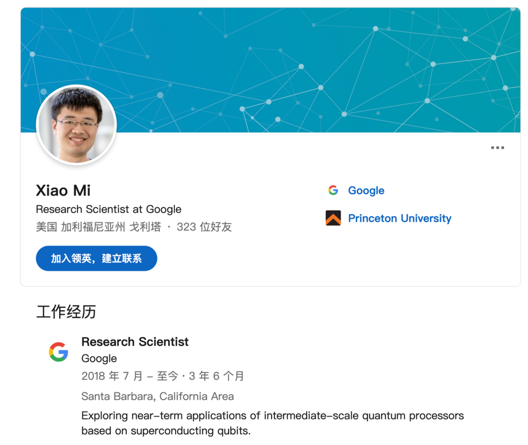 2018 年 7 月,Xiao Mi 加入谷歌任研究科学家,主要探索基于超导量子比特的中型量子处理器的应用。