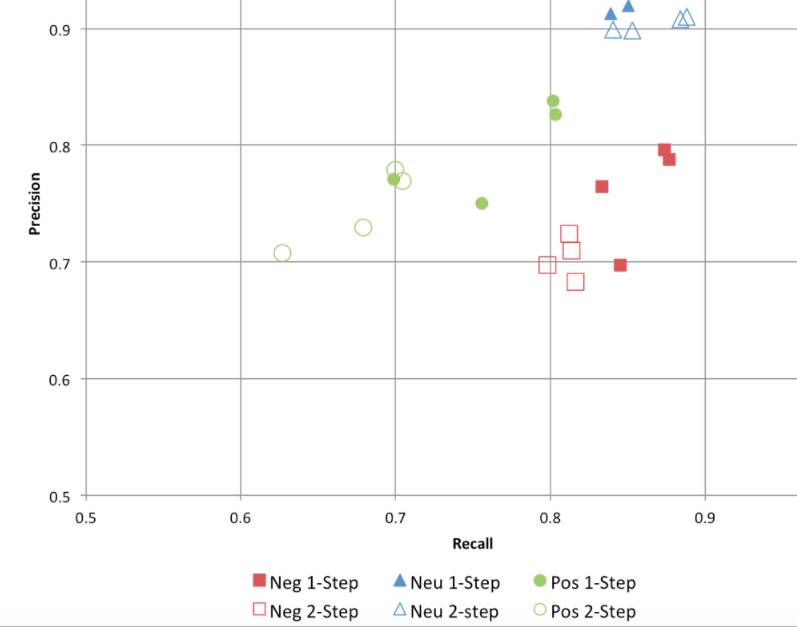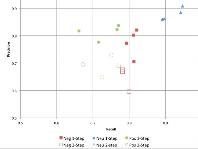 在图9中,我们还展示了朴素贝叶斯分类器对不同类别——负面、中性和正面的准确率和查全率。实心标记表示单步分类器的结果,空心标记表示两步分类器的结果。不同的标记对应不同的特征集。我们可以看出,单步分类的准确率和查全率均高于两步分类。
