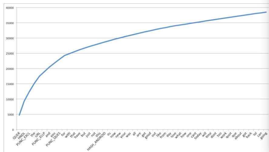 一元词串是可用于文本分类的最简单的一组特征。一条推文可以表示成多组单词的形式。然而,我们将推文的一元词串作为一个特征集使用。单词的出现要比它重复的次数更加重要。Pang等人发现,相比词串的重复,一元词串的出现能够产生更好的效果[1]。这也有助于我们避免缩放数据,进而大大减少训练时间[2]。图4介绍了我们数据集中单词的累积分布。