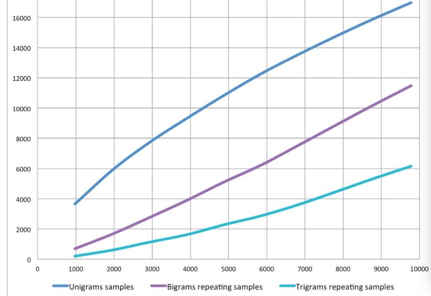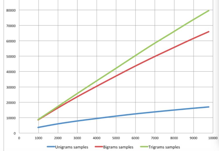 随着n元词串中阶的增长,它们变得越来越稀疏。基于我们的实验,我们发现随着推文数量的增长,二元词串和三元词串数量的增长速度要比一元词串快得多。图5显示了n元词串与推文数量的对比。我们可以注意到,二元词串和三元词串的数量几乎呈线性增长,而一元词串数量的增长趋势仅为对数增长。