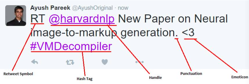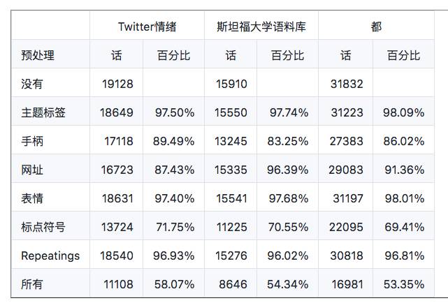 网络上用户产生的内容很少以一种适合算法学习的形式来组织。通过应用一系列预处理操作来规范文本因此变得格外重要。我们采取了一组预处理操作来降低特征集的大小,使其适合于算法训练。图3描述了微博中的各种特征。表3展示了数据集中每条推文各个特征的出现频率。我们也对采取的预处理操作进行了简要的描述。