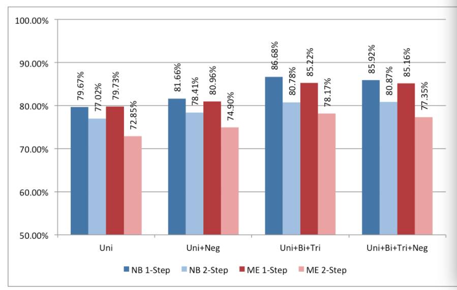 他们尝试了各种特征——一元词串、二元词串、词性,使用了不同的机器学习算法训练分类器——朴素贝叶斯、最大熵模型、可伸缩向量机,并通过统计公共语料库中正面与负面词语的数量,和基准分类器的分类结果进行了比较。他们报告称,词性标注与仅使用二元词串对结果并没有帮助,朴素贝叶斯分类器的效果最好。