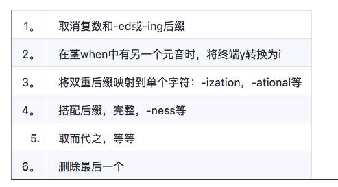 Martin Porter实现了一个词干分析器,并于1980年7月发布。这个词干分析器得到了广泛使用,并最终成为英文词干提取中的一个事实上的标准算法。它在速度、可读性与准确性三者间达到了极好的平衡。这个词干分析器在连续的六个步骤中,使用了约60条转换规则。需要注意的一个重要特征是,该词干分析器并不涉及递归的过程。表7介绍了算法中的各个步骤。