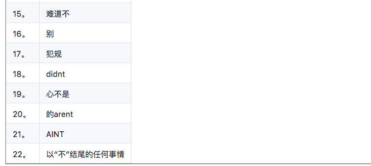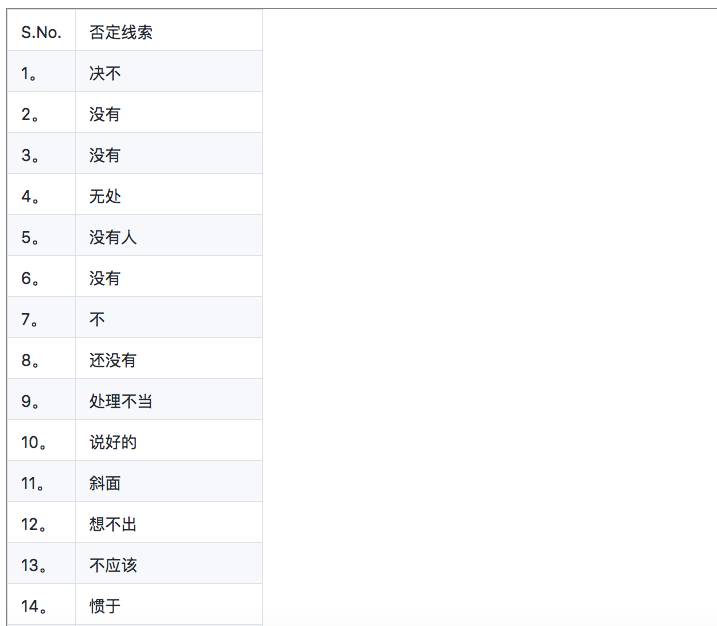 为了检测显式的否定词,我们在文本中查找表8中出现的单词。否定词的搜索通过正则表达式进行。
