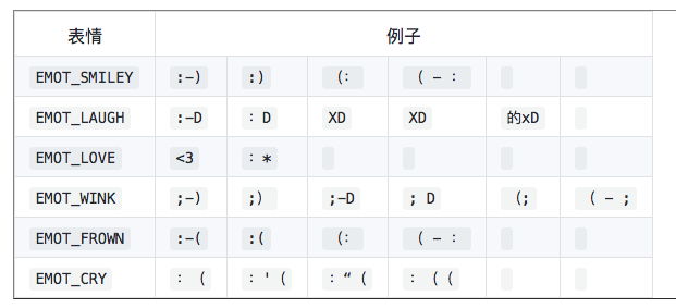 表示快乐的表情对应不同的笑脸,比如":)"、":-)"、": )"、":D"、"=)"等。