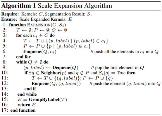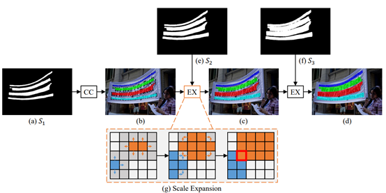 其中 CC 表示计算连通域,EX 表示执行 Scale Expansion 算法,子图 (g) 展示了扩展的过程,如果出现冲突区域,按照先到先得的策略分配标签;算法详情参考下图。
