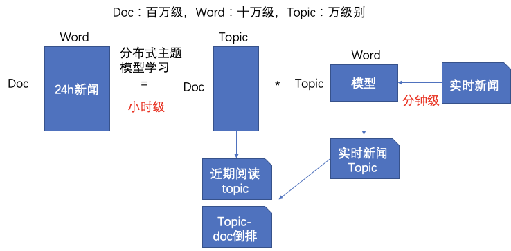 我们使用lightlda构建了1千/1万/10万不同维度的topic模型,来解决分类和tag语义粒度跨度太大问题,同时我们还区分长期topic和时效topic,时效topic用于快速发现热点事件以及提升其分发效率。我们构建了面向新闻的实时topic理解模型,支持小时级全量topic和分钟级增量topic理解,能够快速捕捉热点及进行跟进,模型流程如下。