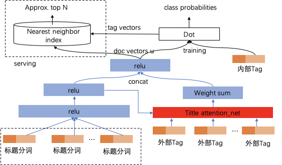 基于Tag2Tag的方式,由于没有考虑到context信息,如标题、类目,容易产生歧义,导致badcase出现,所以更好的思路是利用双塔模型来建模,将外部标题和外部tag,统一编码到左端,看一看Tag编码到右端,利用深度语义匹配进行Tag映射。训练时使用看一看标题和Tag构造训练数据,看一看标题放在左端,将看一看Tag拆成两部分,N-1个放在左端,剩下一个放在右端。特征使用字、分词特征,能从看一看数据泛化到外部数据。预测时首先将内部tag embedding部署到knn服务中,然后对于外部文章和tag,用左端前馈生成文章表示,然后去knn服务中召回最相关的内部tag。其中,引入title attention net来计算外部标签重要度,代替对外部标签avg pool,上述case中,使得“捕鱼”权重更大,更容易找到与核心tag相关的内部tag。
