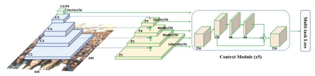 1.检测部分使用 RetinaFace [Deng et al., 2019],RetinaFace 是 Single-stage 的人脸检测方法,能保证检测的速度,并且采用 FPN+Context Module 的方式,提升对小人脸的召回和整体检测精度。另外,加入关键点回归分支一并训练。Multi-Task 的训练方式使得人脸定位和关键点回归相互促进。最后使得检测精度达到 State-of-the-art。