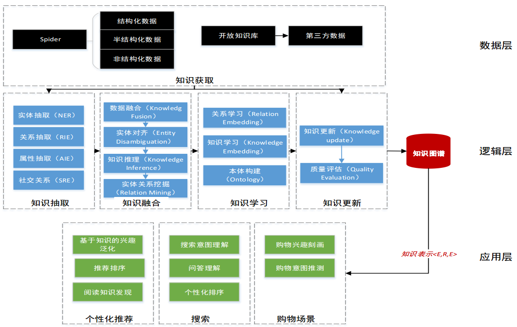 整个知识图谱的构建及应用划分为3层:数据层、逻辑层、应用层;每一层的具体任务如下: