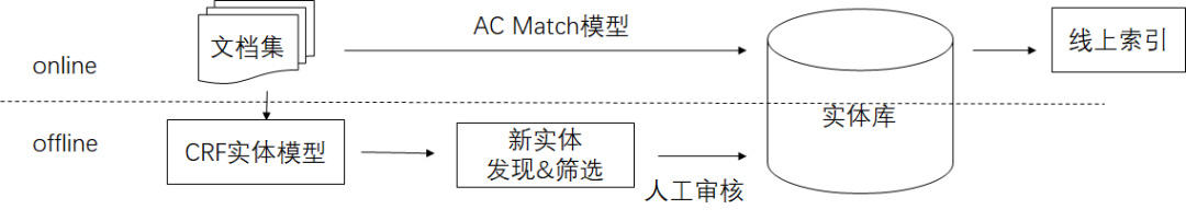 构建推荐系统初期,为了快速实现,我们基于实体库+AC匹配的方式进行实体识别,实体库使用CRF进行新实体发现,频率大于一定的实体再由人工审核进入实体库,这种方式往往忽略了上下文语境,容易引入badcase,对于新实体,识别并线上生效有所延迟。