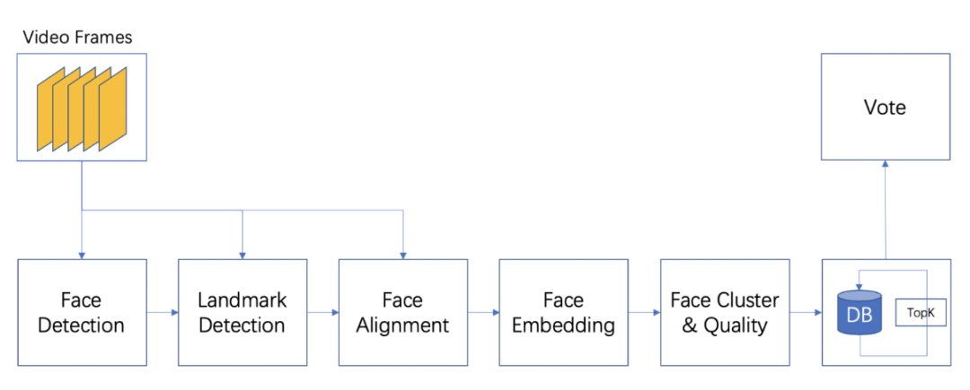 5.同前一步的聚类和选优,我们获得视频里每个人物的优质人脸,并进入人脸识别阶段。识别阶段,我们创造性的采用 2 次搜索的方式来提高准确率。其中第 1 次搜索,使用视频人脸检索库内的种子 ID。具体来说,对于库内每个 ID,其所有图片的特征求平均,作为这个 ID 的种子特征。第 1 次搜索,对于某个视频人脸,在种子人脸库内搜索得到 Top K 个种子 ID,Top K 取 50,从而初步确定 ID 的检索范围。第 2 次搜索,使用视频人脸,在第 1 次搜索得到的 TopK ID 的所有图片里面进行检索。并通过投票确定得分最高的 ID,作为该模块的输出。
